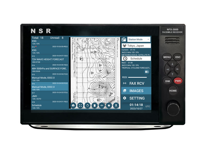 With Large 10-inch color LCD and touch screen operation, the NFX-3000 is NSR’s modern Weather Fax. Selected images/charts can be printed in three ways: on a printer directly connected, on a printer connected to the bridge networks and on a printer connected to a PC from a USB stick, etc. Weather charts can be transferred to the computer via LAN